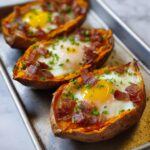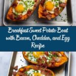 This Breakfast Sweet Potato recipe features baked sweet potatoes stuffed with a savory mixture of bacon, butter, shredded cheddar cheese, and topped with an egg, baked until just set. Perfect for a hearty and nutritious breakfast or brunch, it combines the natural sweetness of sweet potatoes with the rich flavors of bacon and cheese, creating a satisfying meal that’s both comforting and visually appealing.