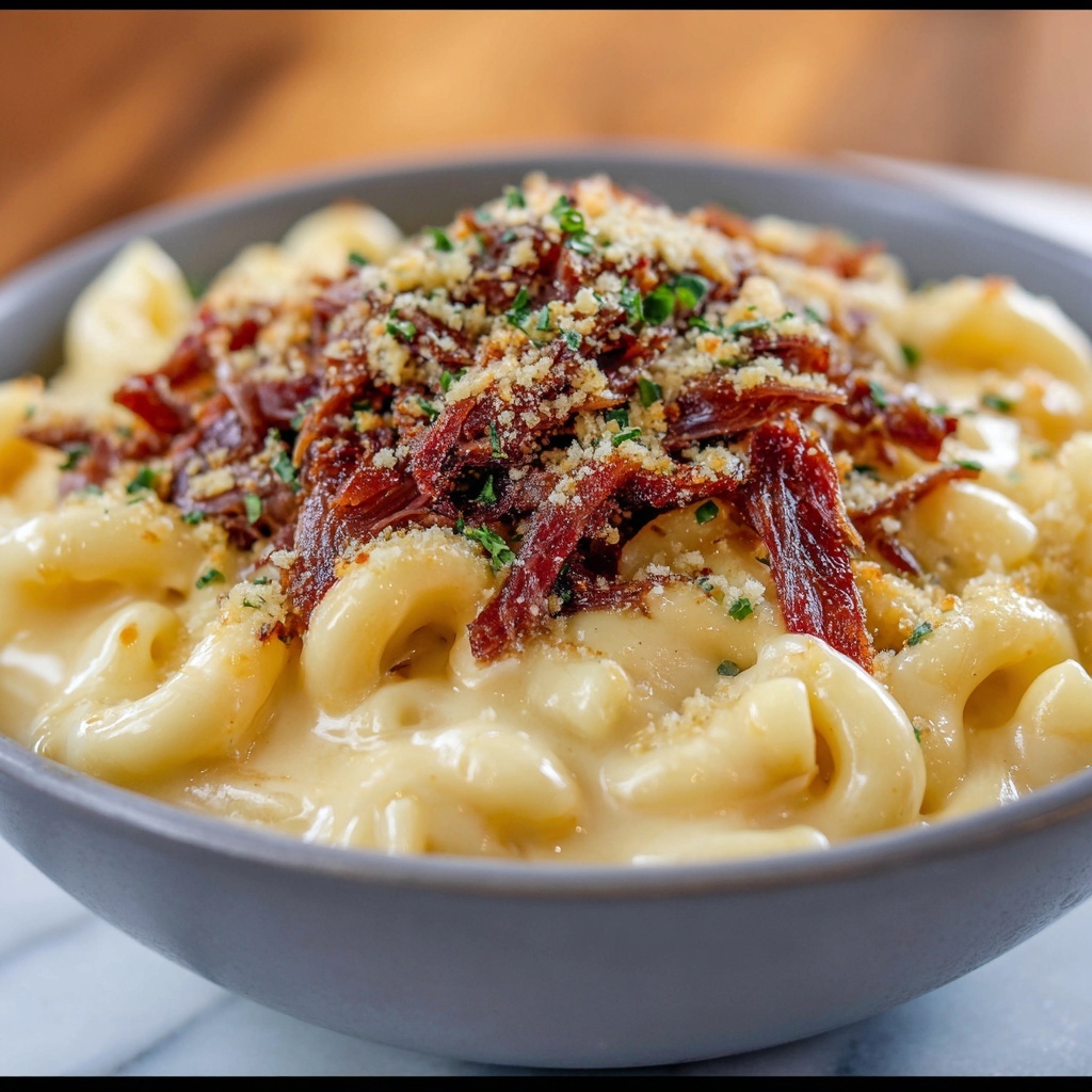 A hearty and indulgent dish combining creamy mac and cheese with tender shredded beef brisket, enhanced by a blend of flavorful spices and topped with optional crispy onion strings for added texture. Perfect for a comforting meal that satisfies both mac and cheese lovers and barbecue fans alike.