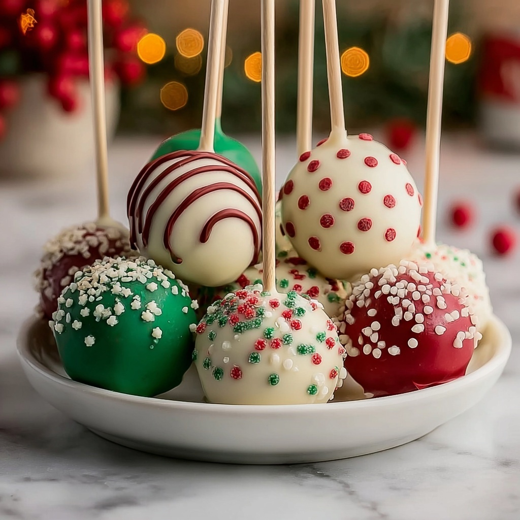 - Dip and Decorate: Melt the white chocolate or candy melts according to package instructions, usually in a microwave-safe bowl in short bursts, stirring in between. Dip one end of each lollipop stick into the melted chocolate and insert it halfway into each cake ball—this helps the stick adhere securely. Then, dip the entire cake pop into the melted chocolate, gently tapping off excess. Immediately decorate with holiday sprinkles before the coating sets. Place the completed cake pops upright in a styrofoam block or a stand to dry completely.