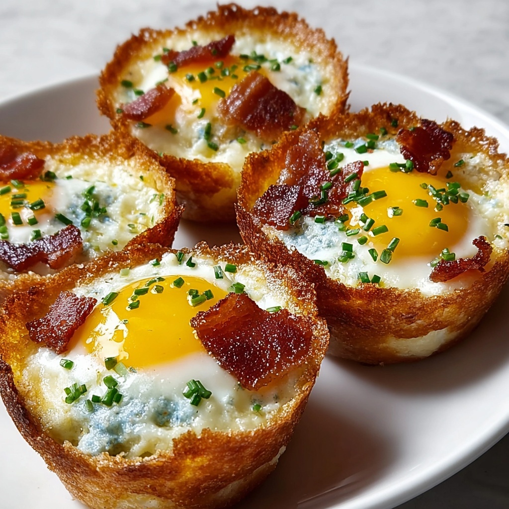 Cloud eggs with a savory twist of crumbled blue cheese and crispy bacon, baked to perfection for a fluffy texture and rich flavor. This quick and impressive breakfast or brunch dish features whipped egg whites baked lightly before topping with yolks, resulting in a delightfully airy treat garnished with fresh chives.