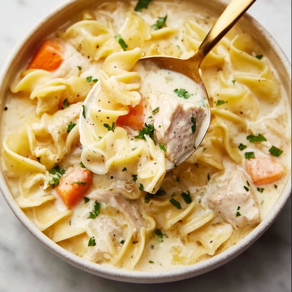 - Serve: Ladle the creamy chicken noodle soup into bowls and serve warm for a satisfying and comforting meal.