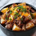 This Crockpot Loaded Steak and Potato Bake is a comforting and hearty one-pot meal perfect for busy days. Tender cubes of sirloin steak are slow-cooked with diced russet potatoes, onions, and a flavorful garlic-beef broth mixture, then topped with melted cheddar cheese, sour cream, and fresh green onions for a satisfying dinner the whole family will love.