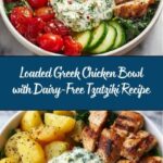 This Loaded Greek Chicken Bowl with Dairy-Free Tzatziki is a flavorful and healthy Mediterranean-inspired dish featuring marinated grilled chicken, vibrant fresh vegetables, and a creamy, dairy-free tzatziki sauce made from coconut or almond-based Greek yogurt. Perfect for a wholesome meal, this bowl combines tender chicken, tangy olives, crisp cucumbers and onions, and fluffy rice for a satisfying and nutritious lunch or dinner.