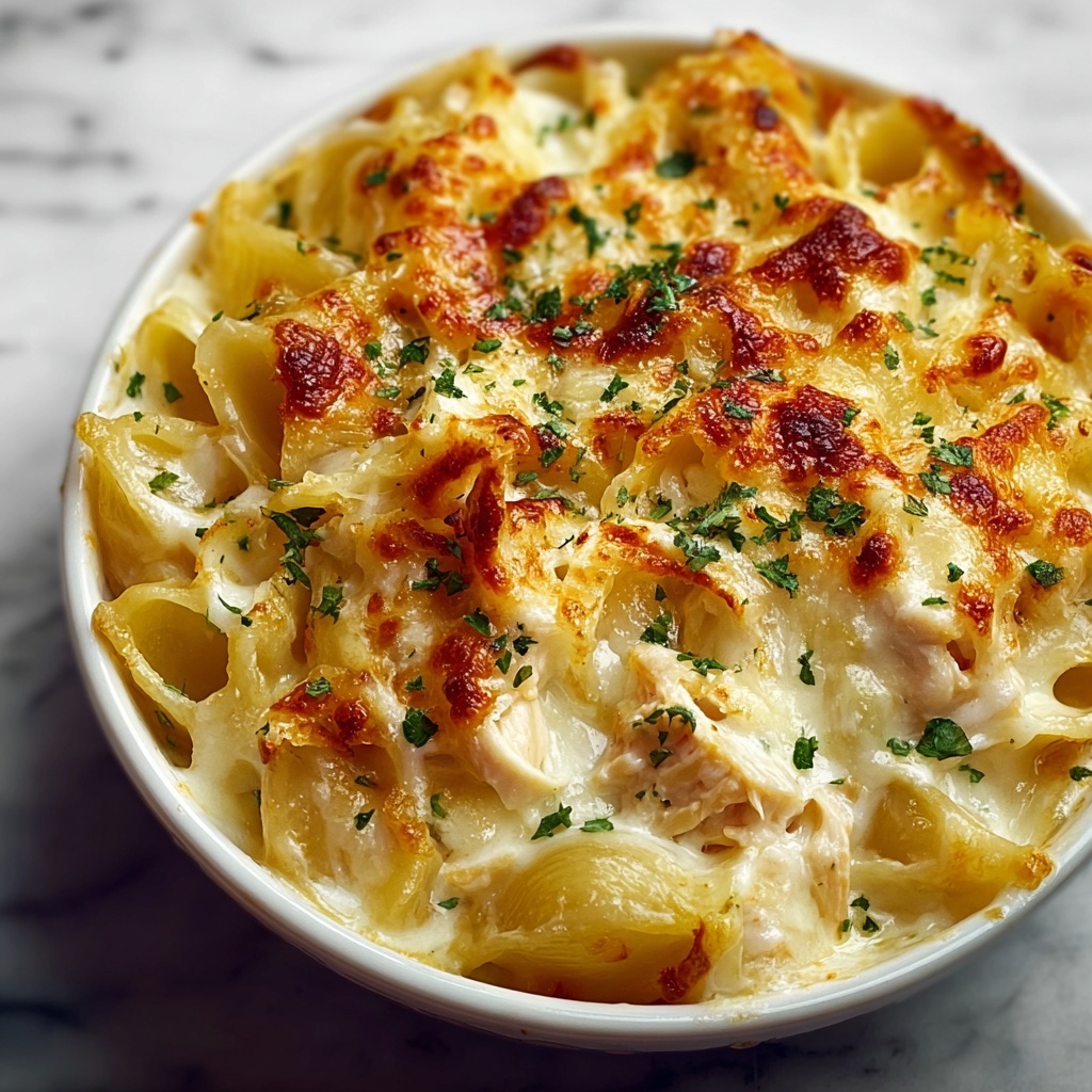 A scattering of chopped parsley or fresh thyme over the warm casserole brightens the dish visually and adds a hint of herbaceous freshness that balances the richness of the creamy noodles and chicken beautifully.