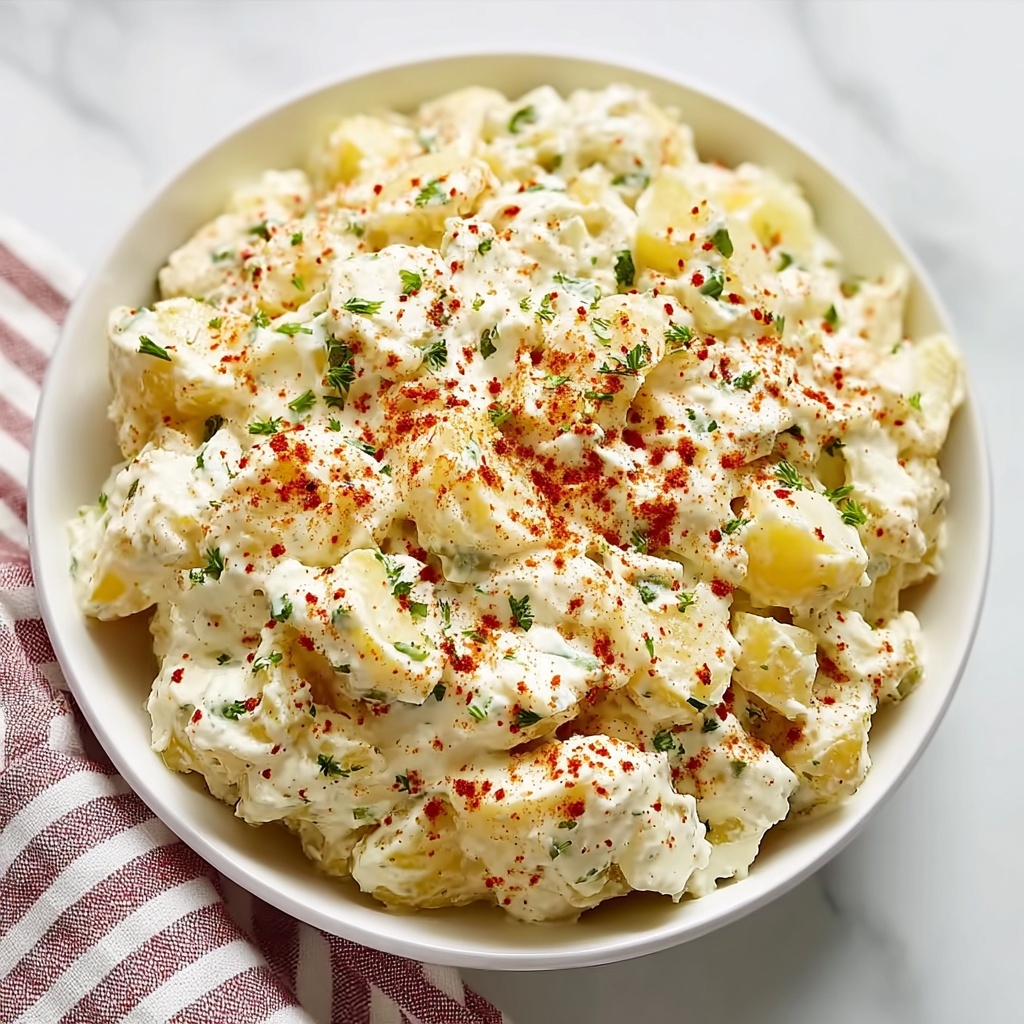 To give your potato salad that final touch, sprinkle chopped fresh parsley or chives on top. These bright green garnishes not only add a pop of color but also a fresh herbal note that complements the creamy dressing perfectly. You can even add a dusting of paprika for a warm tone and subtle smokiness.