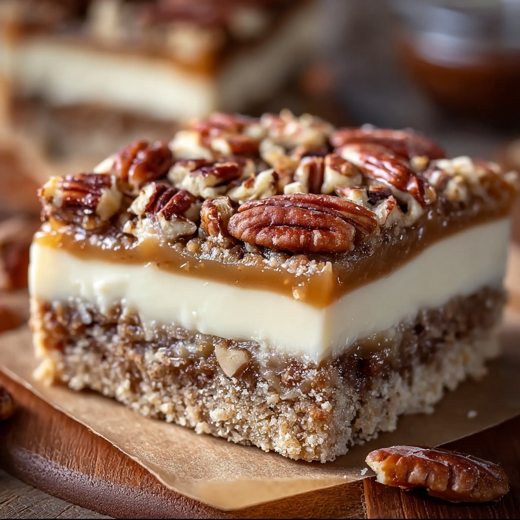 These bars are stunning on their own, but you can add a little extra flair with a sprinkle of powdered sugar, a drizzle of caramel sauce, or a few whole toasted pecans on top. Each garnish adds both visual appeal and enhances the nutty, sweet notes of the dessert.