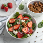 A vibrant and refreshing Strawberry Spinach Salad combining fresh baby spinach, sweet strawberries, tangy red onion, savory bacon, crunchy candied pecans, and creamy feta cheese, all tossed in a luscious honey-balsamic vinaigrette with a hint of Dijon mustard and poppy seeds.