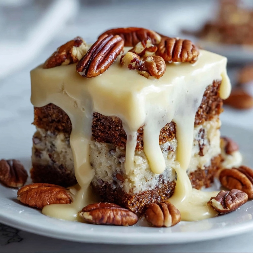You could omit the pecans and replace them with toasted coconut or crushed cookies for crunch, but the classic pecan taste is what truly defines this cake.