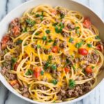This Taco Spaghetti recipe combines the bold flavors of taco seasoning with hearty spaghetti noodles for a quick and delicious one-pan meal. Perfect for busy weeknights, it features ground beef cooked with onions and taco spices, simmered with Rotel tomatoes and pasta, then topped with melted cheddar cheese and fresh cilantro.