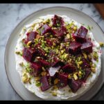 Once the beets have cooled slightly, gently fold them into the whipped feta or arrange them artfully on top. Now sprinkle chopped pistachios and crushed pink peppercorns to add crunch and vibrant pops of color. Don’t forget the final flourish—a generous drizzle of your best olive oil, and if you’re feeling fancy, a hint of vegan honey or maple syrup plus a sprinkle of sumac or za’atar to deepen the flavor profile.